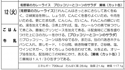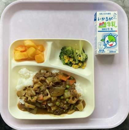今日は、冬野菜のカレーライス、ブロッコリーとコーンのサラダ、黄桃(カット缶)でした。