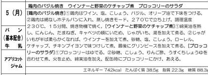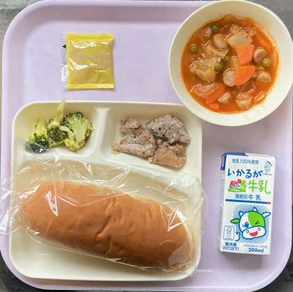 今日は、コッペパンに牛乳、鶏肉のバジル焼き、ウインナーと野菜のケチャップ煮、ブロッコリーのサラダでした。