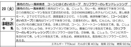 豚肉のカレー風味焼き、コーンと白菜のスープ、カリフラワーのレモンドレッシングでした。豚肉のカレー風味焼きは、カレー味で食が進みました。