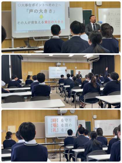 時を守り、場を清め、礼を正すという校長先生の言葉や反応の早さが責任感の表れ、ということについて担当の先生から話がありました。