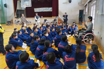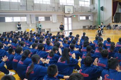 今回は、パラリンピックキャラバン(障がい者スポーツ体験講演)で3人の講師の方(くまさん、ゆうさん、よっしーさん)に来ていただきました。