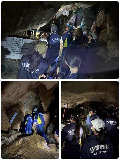 鍾乳洞の中を、インストラクターさんの解説を聞きながら探検しました。中にはこうもりもいて、生徒達は興味津々の様子です。