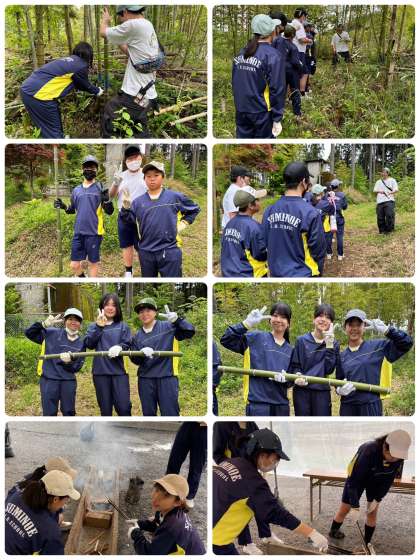 選択体験(1,4組) 竹取物語 バームクーヘン作りのために竹を切り、火おこしをしています。