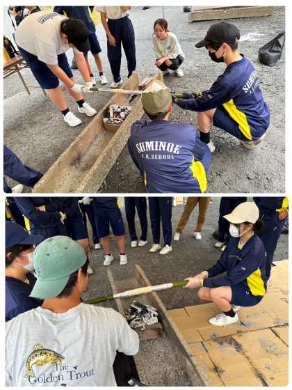 竹取物語 切ってきた竹に、アルミホイルを巻き、その上に生地をつけてバームクーヘンを焼きます。