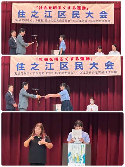 7月13日、すみのえ舞昆ホールにて、社会を明るくする運動 住之江区民大会の各部門表彰式が行われ、本校から2名の生徒が表彰されました。