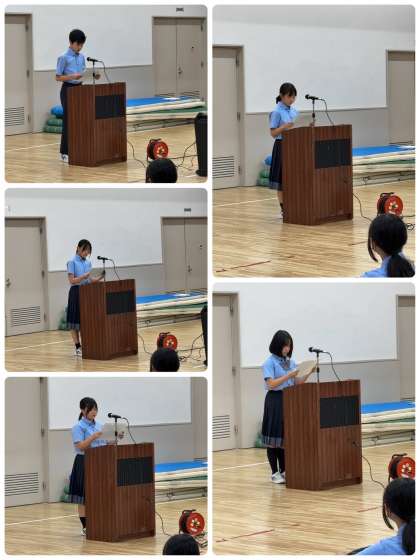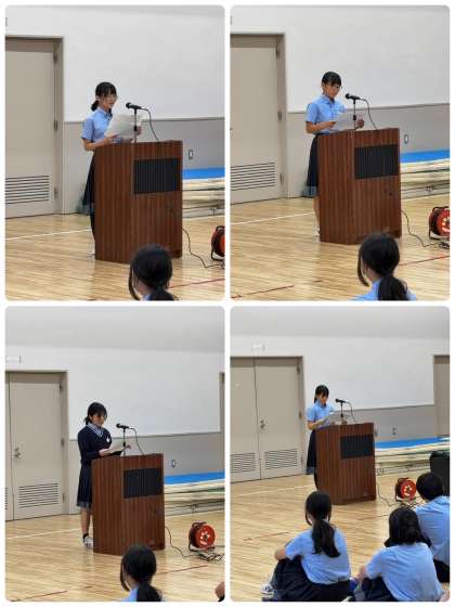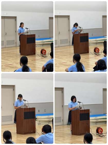 発表者の中には、大勢の前に立って発表するということが初めての人がたくさんいて、手に持つ原稿も震えるほど緊張しながらも発表していました。この機会はきっと発表者にとっていい経験になったと思います。また、聴いている側の大勢の人たちも発表者の想いを感じながら緊張のあまり声が小さくなり聞きづらかったり、早口になって聞き取りづらかったりしたけれども、発表者の気持ちと想いをくみ取り一生懸命聴くことができました。いつまでも「おもいやり」が溢れる集団でありたいですね。