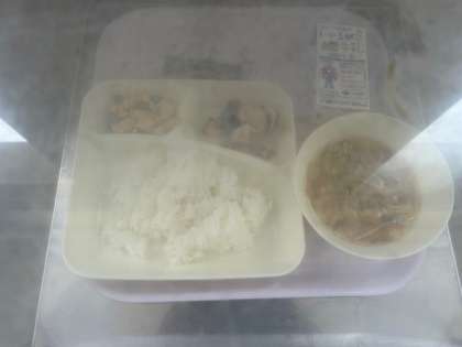 今日の献立は、ごはん、牛乳、さけのみそ焼き、五目汁、えんどうの卵とじ、焼きのりです。