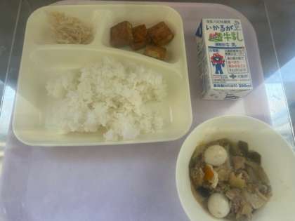 今日の献立は、ごはん、牛乳、八宝菜、あつあげの中華みそだれかけ、もやしの中華あえです。