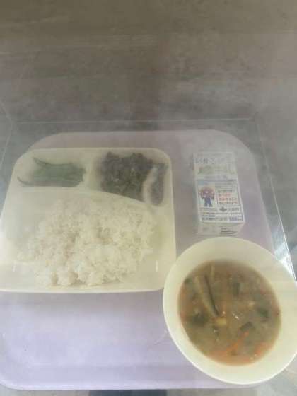 今日の献立は、ごはん、牛乳、チンジャオニューロウスー、中華みそスープ、えだまめです。
