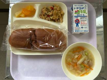 今日の献立は、黒糖パン、牛乳、押麦のチキンパエリア、ウインナーとキャベツのスープ、ミックスフルーツです。