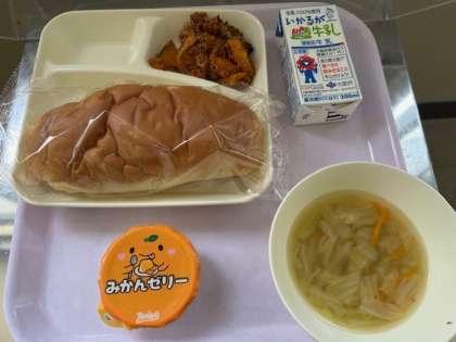 今日の献立は、おさつパン、牛乳、かぼちゃのミートグラタン、スープ、みかんゼリーです。