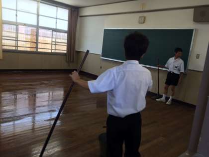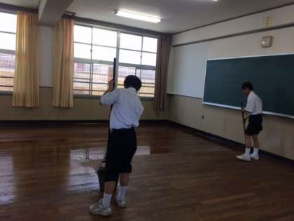 1学期の終業式、学級活動終了後、各教室にて油引きが行われました。2学期からもキレイになった教室で学習できるよう、ズボンをたくし上げて、油を引いてくれました。
