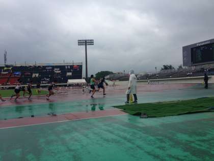 大会2日目は、4×100mリレーに酒井勇希くん、尾山優成くん、北浦稔くん、山本智也くんが出場しました。雨が降る中、メンバーは決勝進出を目指し心一つに臨みました。