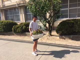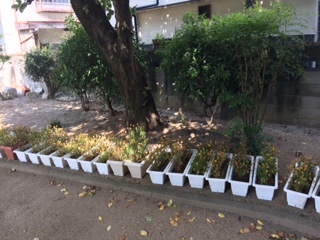連日、猛暑日が続いています。生徒会が育てている、正門のプランターも、強い陽射しを浴びて、たいへん辛そうです。生徒会長ほか有志たちの手で、日影にプランターを避難させてくれました。