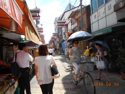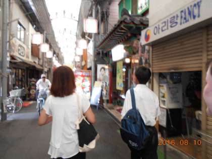 コリアタウンへ、ソンセンニムとフィールドワークに行きました。鶴橋市場を通り、日本最古の橋「つるのはし」や御幸森神社を見学して、コリアタウンでは韓国朝鮮の食文化を中心とした活気ある生活に触れることができました。暑い日でパッピンス(かき氷)が美味しかったです。