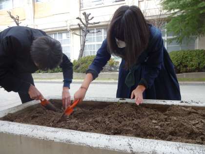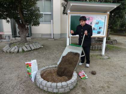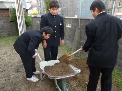 12月24日の放課後、以前体育館前に植えていたスイセンの球根を垣根の花壇に移植する作業をしました。