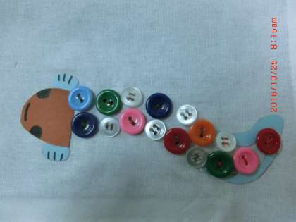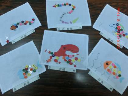 また、ボタンで魚のうろこを表現した作品も展示しました。15個を目標にボタンつけをしました。初めは1時間の授業で1つしかボタンを縫い付けられなかった生徒もいましたが、練習するうちに、すいすいとボタンを縫い付けられるようになってきました。