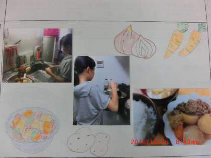 1品料理を調理した際のレポートを展示しました。自分の好物を調理していたり、家族の晩御飯を作ったりと様々です。2学期には調理実習も予定していますので、今後もお家で台所に立ってほしいなと思います。