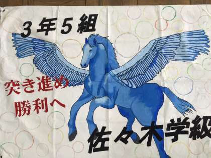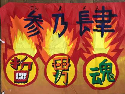 2年生校舎3階に、体育大会の入場行進の時に掲げた「学級旗」を展示しました。各クラス体育大会への思いをデザインし、選んだものを組み合わせて工夫をこらし、思いを込めて描き上げた作品です。情熱あふれる学級旗をご覧ください。