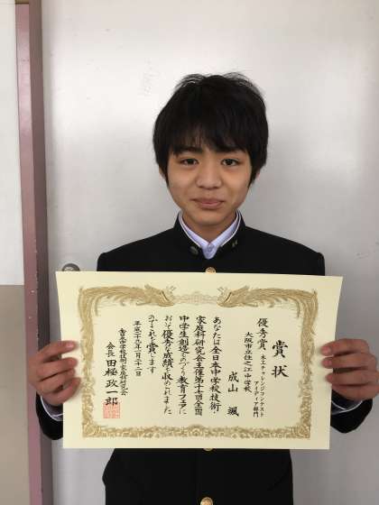 成山君は全日本技術家庭科研究会主催の第17回全国中学生創造ものづくり教育フェア 木工チャレンジコンテストのアイディア部門において優秀賞を受賞しました。