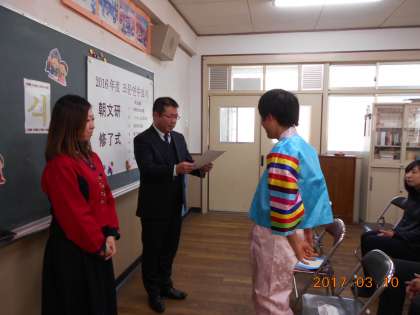 民族講師のユンミファソンセンニムと校長先生から修了証書を授与されました。