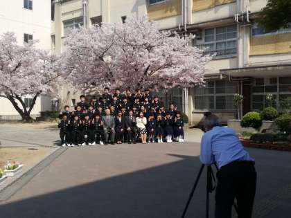 満開からやや桜吹雪が舞い散る中、学級写真撮影を行いました。