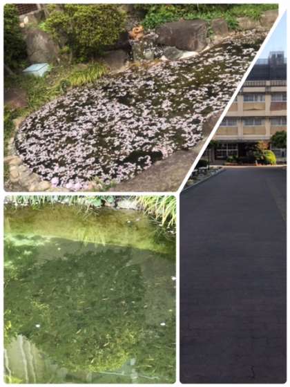 また、玄関正面の池は桜の花びらがたくさんのところをきれいにしていただき、メダカやシラサエビを放流しました。