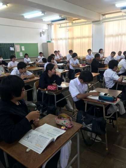 先生の工夫により、助動詞を覚える歌を暗唱していました。