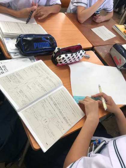 一人の意見が班のメンバーに伝わり、さらに発展していくことができます。また、一人では考えが浮かばない生徒は、班のメンバーの意見を聞いて発想することができます。