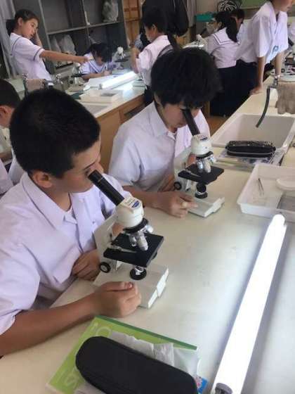 理科の授業では、実験室で葉脈の観察を行なっています。