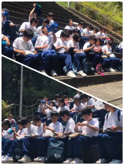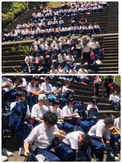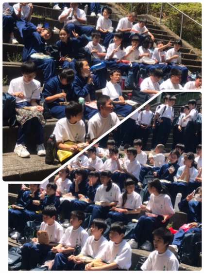 つどいの広場で学級写真撮影した後、昼食です。クラスごとに楽しく食べています。