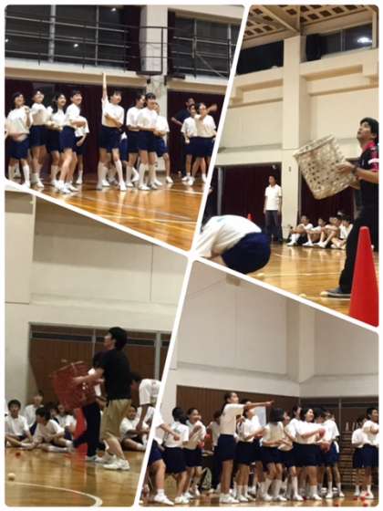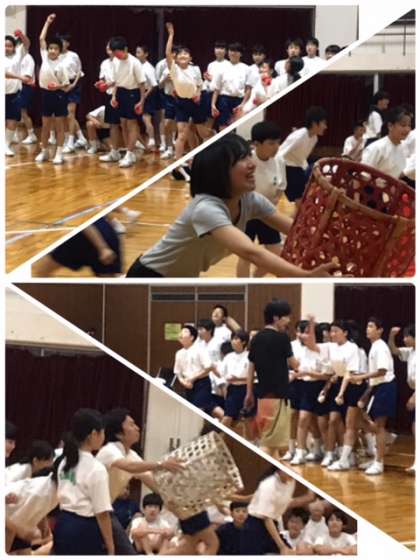 担任の先生が持つカゴに玉入れを入れるゲームです。