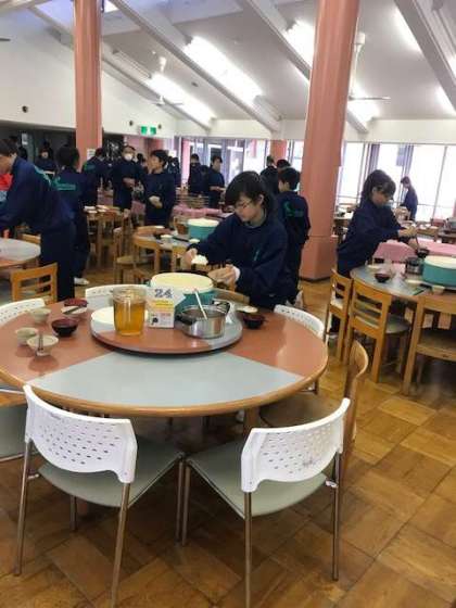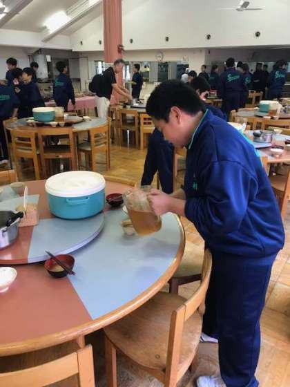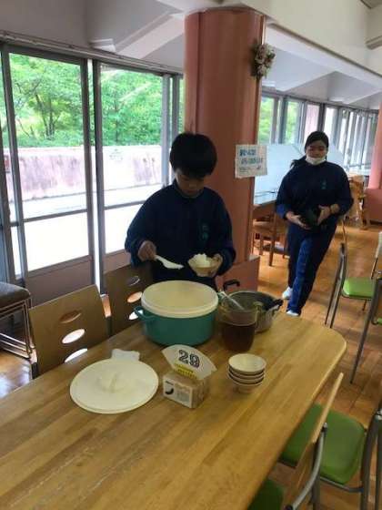 食事係が、班員分のご飯とおみそ汁、お茶を用意しています。