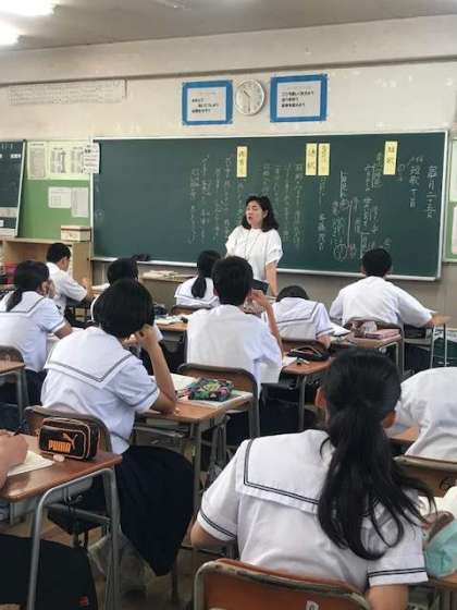 生徒にわかりやすいように、黒板に色付き画用紙を貼って工夫されています。