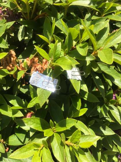 葉っぱにアルミホイルを小さく切ってはさんでいる様子を見つけました。