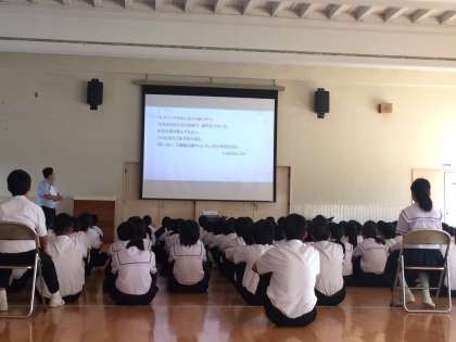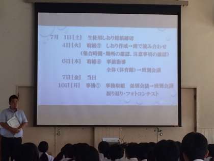 6時間目、体育館にて学年集会を行い、7月7日 京都への校外学習についての説明がありました。