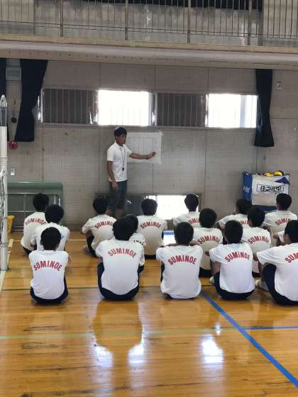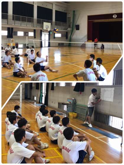 座った状態で「拾うつなぐ打つ」などの連携ができ、仲間と作戦を立ててゲームができる、を本時の目標にしています。