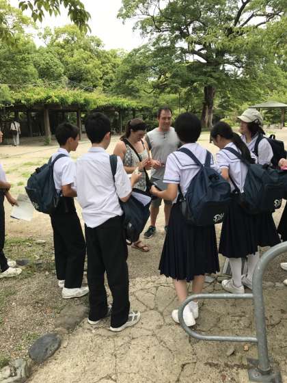 外国の方に質問をして、サインをもらったり写真を撮ってもらったりしている様子です。