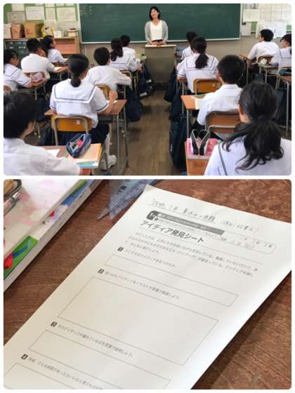 技術の授業では、アイデア発見シートを使って社会の発展と技術の在り方を考える活動を行なっています。
