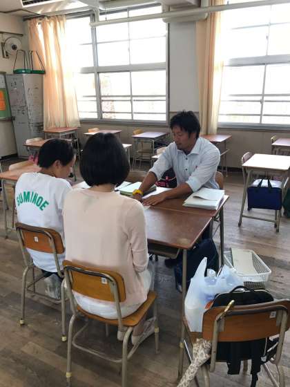 1学期を振り返り、学習面の見直しや夏休みの過ごし方等を担任の先生と一緒にお話しています。