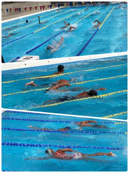 青空の下のプールは、綺麗なブルー色をしています。さまざまな泳法で体力を使いきって練習を行えています。