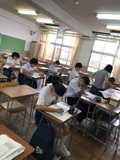 国語、数学、英語、社会の4教科の基礎的・基本的事項の確認で学習しています。