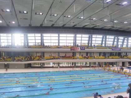 本校から200m平泳ぎで、田中くんが出場します。昨日の台風の影響により、タイムレース決勝の一発勝負となりました。
