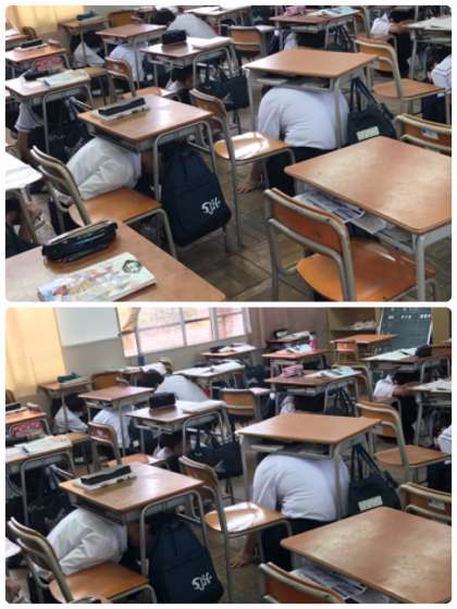 11時地震発生として、身を守る行動として机の下に潜り込みました。