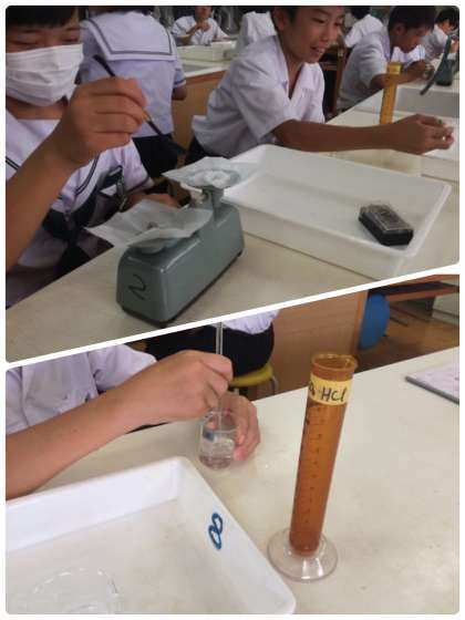 密度による物質の区別として実験を行いました。上ざら天秤で食塩の質量を測ったり、メスシリンダーで水の体積を測ったりしています。