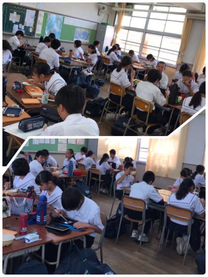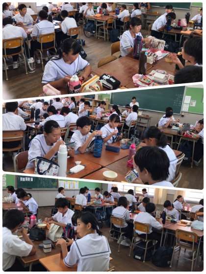 どのクラスも班ごとに座り、和やかに食べています。ご飯を食べている時も、みんな笑顔で雰囲気もよいですね。