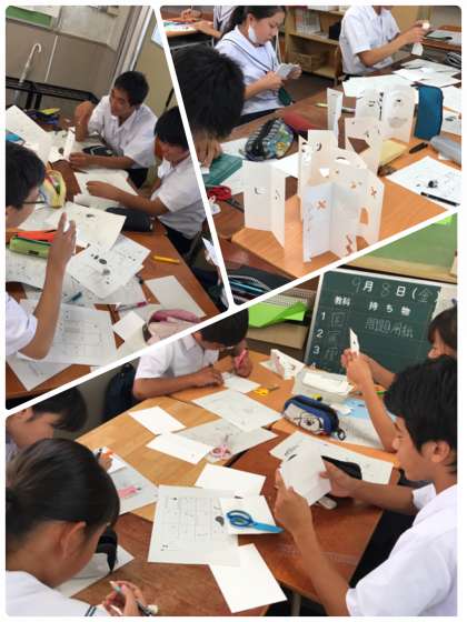 2年生は、白い画用紙を細工しながらハサミで切り込みを入れて、立体物を作成しています。