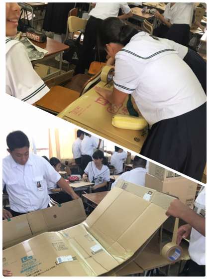 ダンボールをつなぎ合わせて、学年劇の大道具の家を作っています。