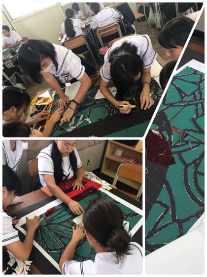 黒色の画用紙を切り抜き、セロハンを貼ってステンドグラスを作っています。