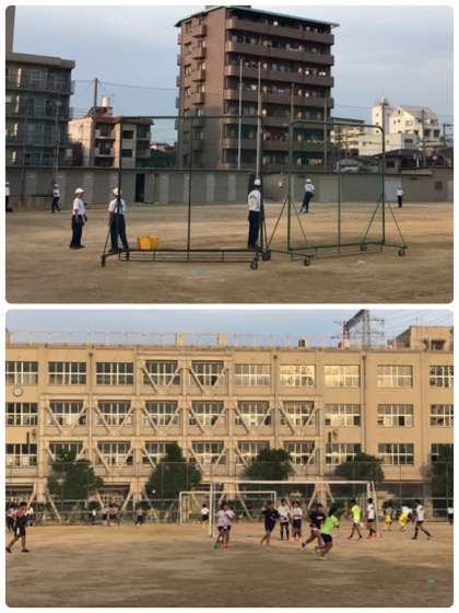 秋空の夕暮れ、グラウンドでは、サッカー部・ラグビー部・野球部・ソフトボール部が活動しています。